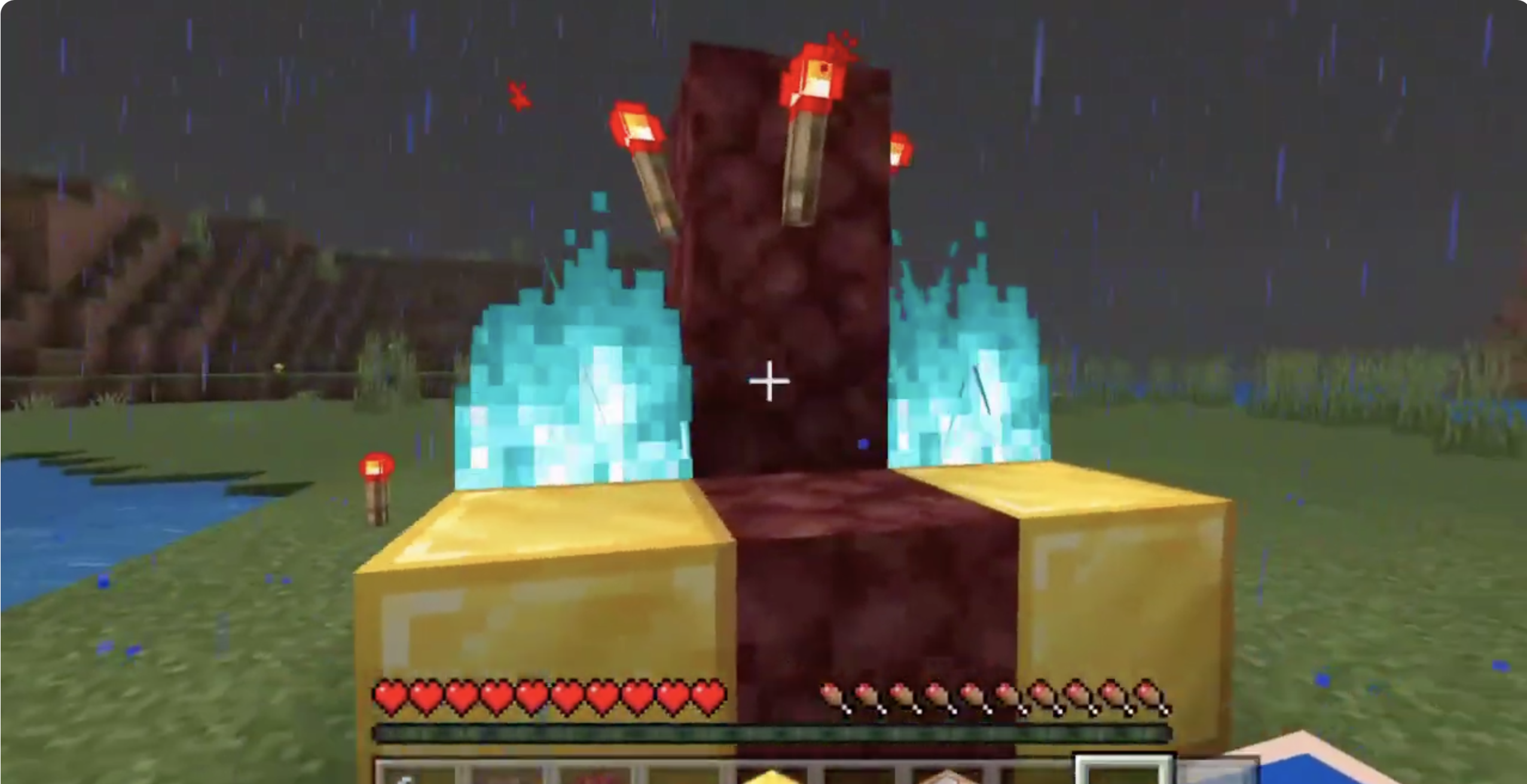Γωνίες με χρυσό μπλοκ γύρω από έναν πυρήνα Netherrack με πυρσούς από redstone και ένα κεφάλι Steve.