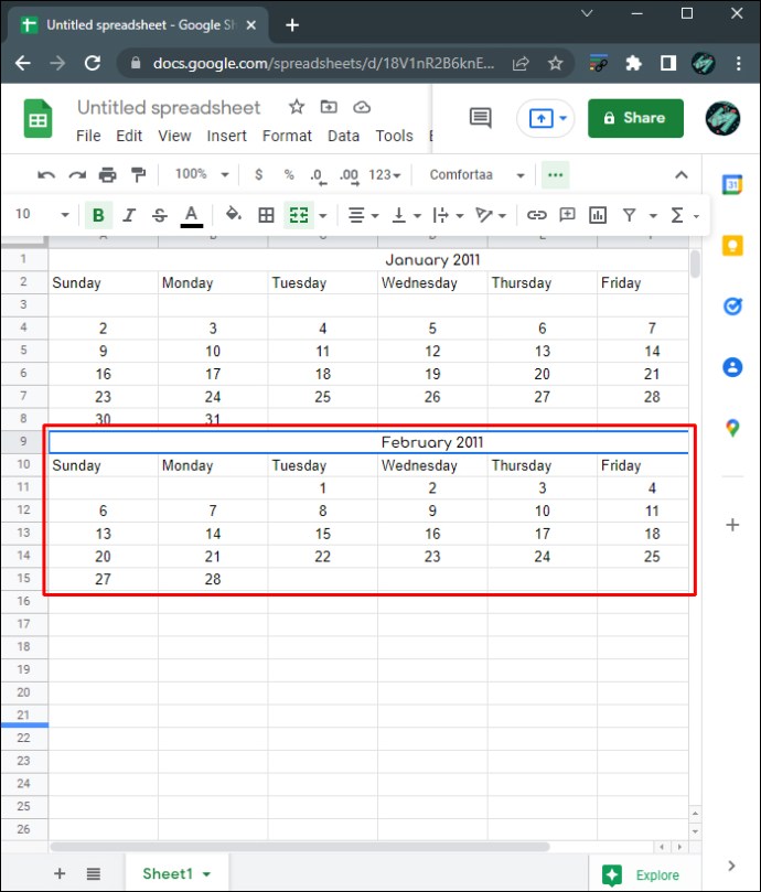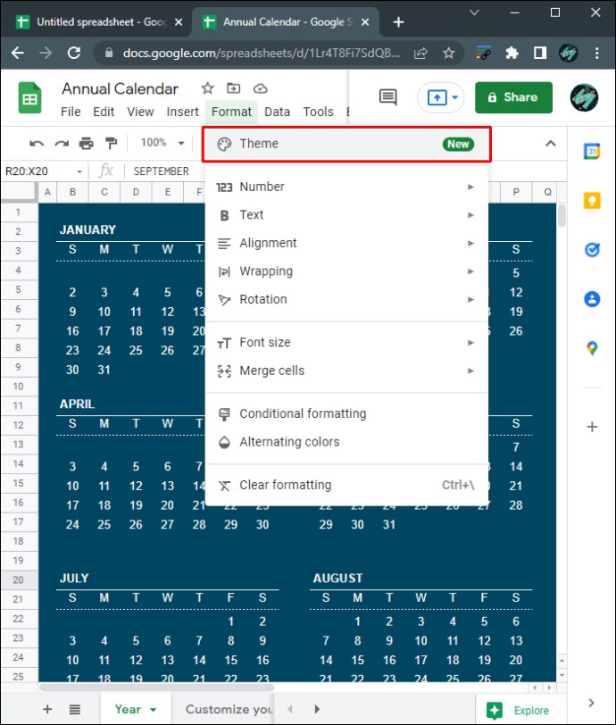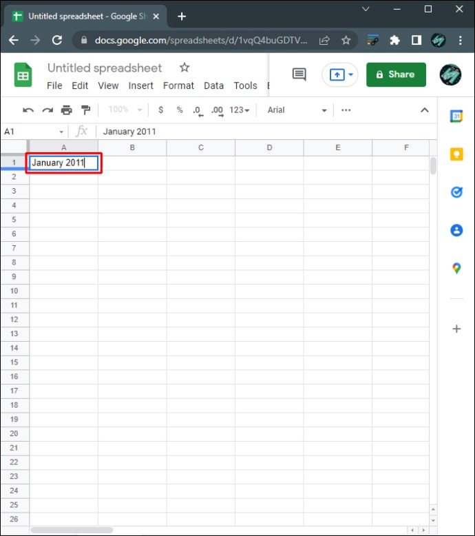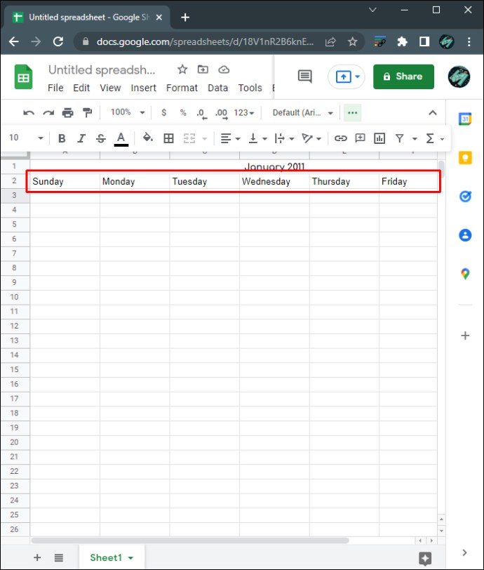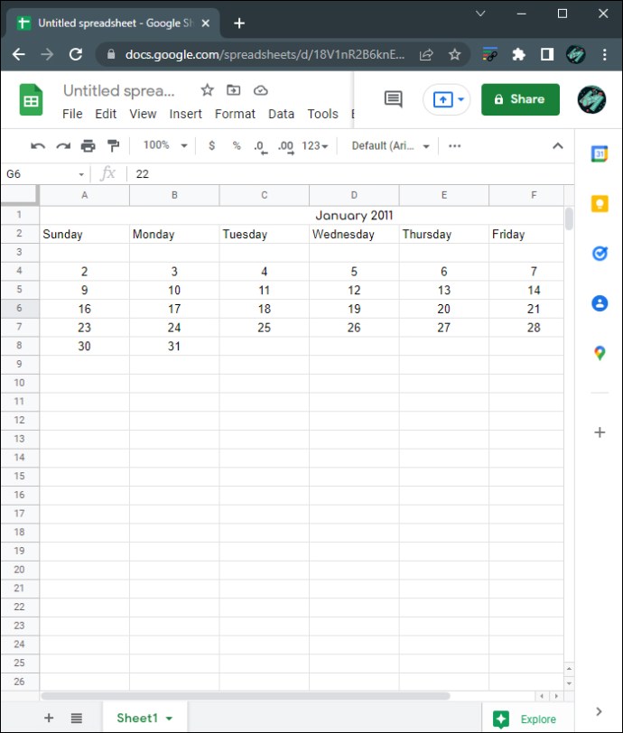 Όπως Τα Φύλλα Google κατασκευάστηκαν αρχικά για χρήση με επιτραπέζιους υπολογιστές, η δημιουργία ημερολογίου σε υπολογιστή είναι η πιο εύκολη μέθοδος λόγω της διαθεσιμότητας του πληκτρολογίου και του ποντικιού. Κάνουν την επεξεργασία κελιών και την εισαγωγή δεδομένων και τύπων πολύ πιο εύκολη σε έναν επιτραπέζιο υπολογιστή σε αντίθεση με μια φορητή συσκευή. Για να δημιουργήσετε ένα ημερολόγιο στα Φύλλα Google σε υπολογιστή, ακολουθήστε τα εξής βήματα: