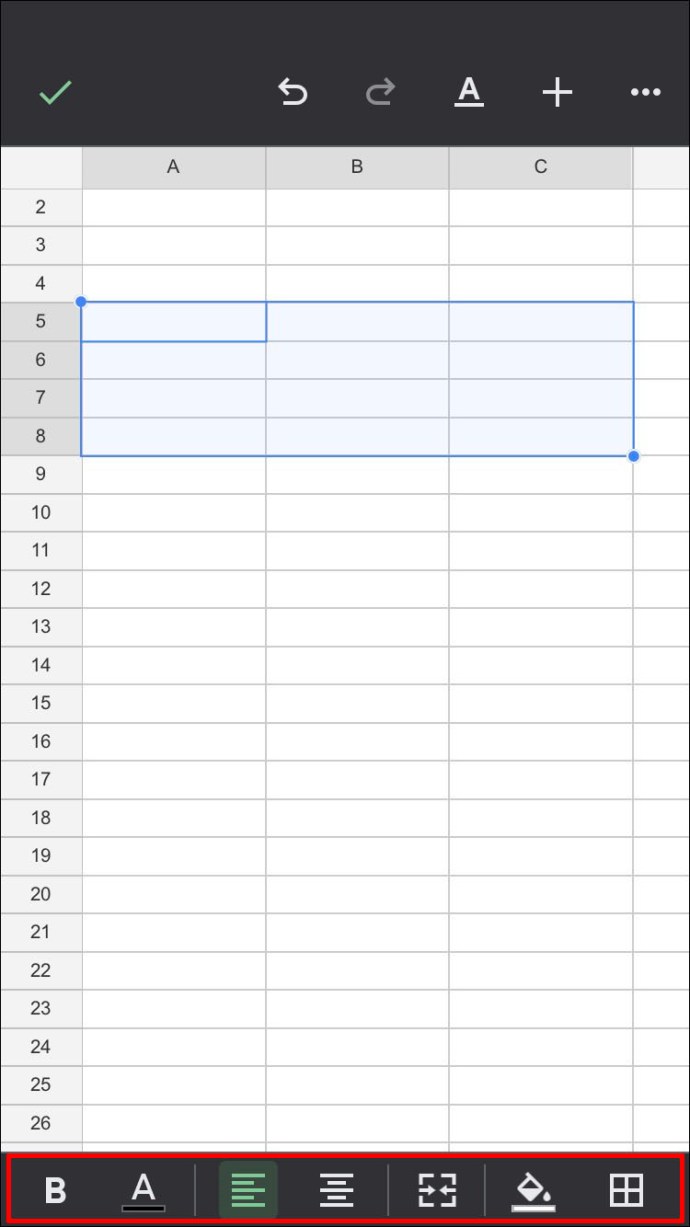 Όπως και στην έκδοση επιτραπέζιου υπολογιστή, μπορείτε να μορφοποιήσετε τις στήλες και τα κελιά χρησιμοποιώντας τα εργαλεία μορφοποίησης στο κάτω μέρος της οθόνης. Πατώντας παρατεταμένα σε ένα κελί, στήλη, ή η σειρά θα αποκαλύψει τις εντολές αντιγραφής και επικόλλησης. Οι εντολές”Συγχώνευση”,”Στοίχιση”και”Γραμματοσειρά”είναι διαθέσιμες στο κάτω μέρος της οθόνης.