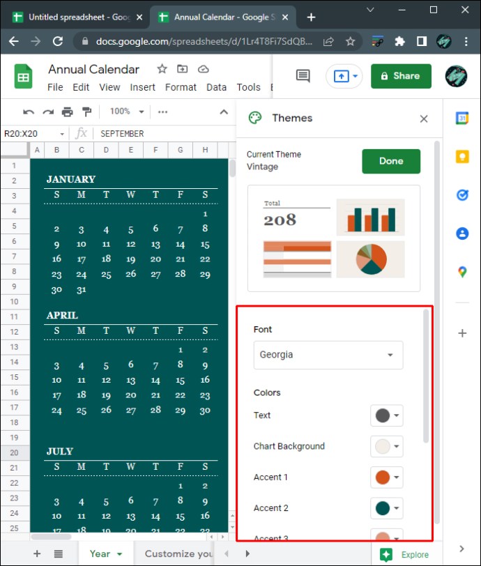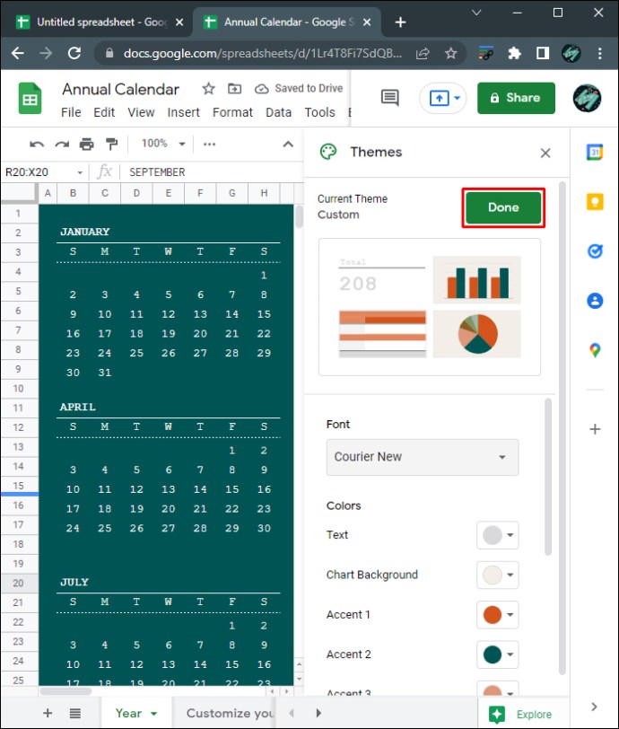 Μόλις ολοκληρώσετε την προσαρμογή του ημερολογίου, κάντε κλικ στο”Τέλος”.Κατά την επεξεργασία του ημερολογίου των Φύλλων Google στο διαδίκτυο, θα αποθηκεύονται αυτόματα τυχόν αλλαγές. Εάν είστε εκτός σύνδεσης αυτήν τη στιγμή, το αρχείο θα ενημερωθεί μόλις συνδεθείτε ξανά.