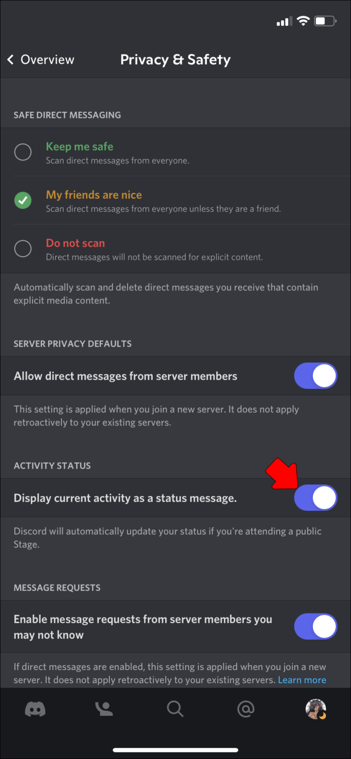 Una vez que esté en la página de configuración de Privacidad y seguridad, apague la alternar para”Mostrar la actividad actual como un mensaje de estado”.