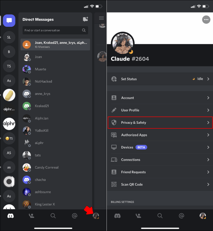 Para comenzar, inicie la aplicación móvil Discord y haga clic en el ícono de su perfil ubicado en la barra de navegación inferior. Desde allí, elige la opción”Privacidad y seguridad”en el menú de configuración.