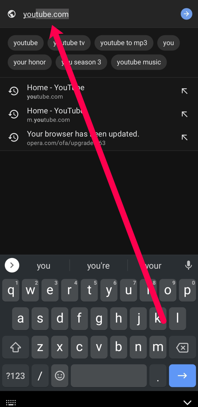 Abre “Opera” y escribe “youtube.com” exactamente como se muestra pero sin el comillas en la”barra de direcciones”.