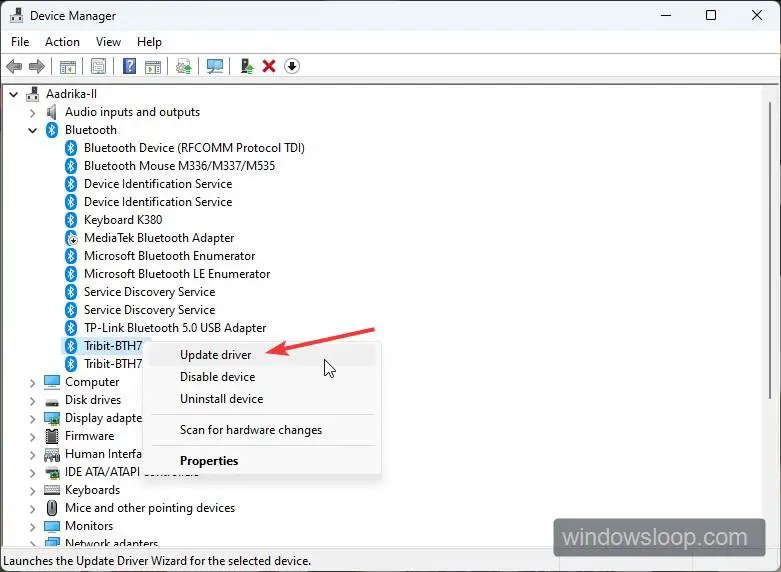 Paso 4: A continuación, haga clic con el botón derecho en su altavoz Bluetooth/auriculares y seleccione la opción”Actualizar controlador“.