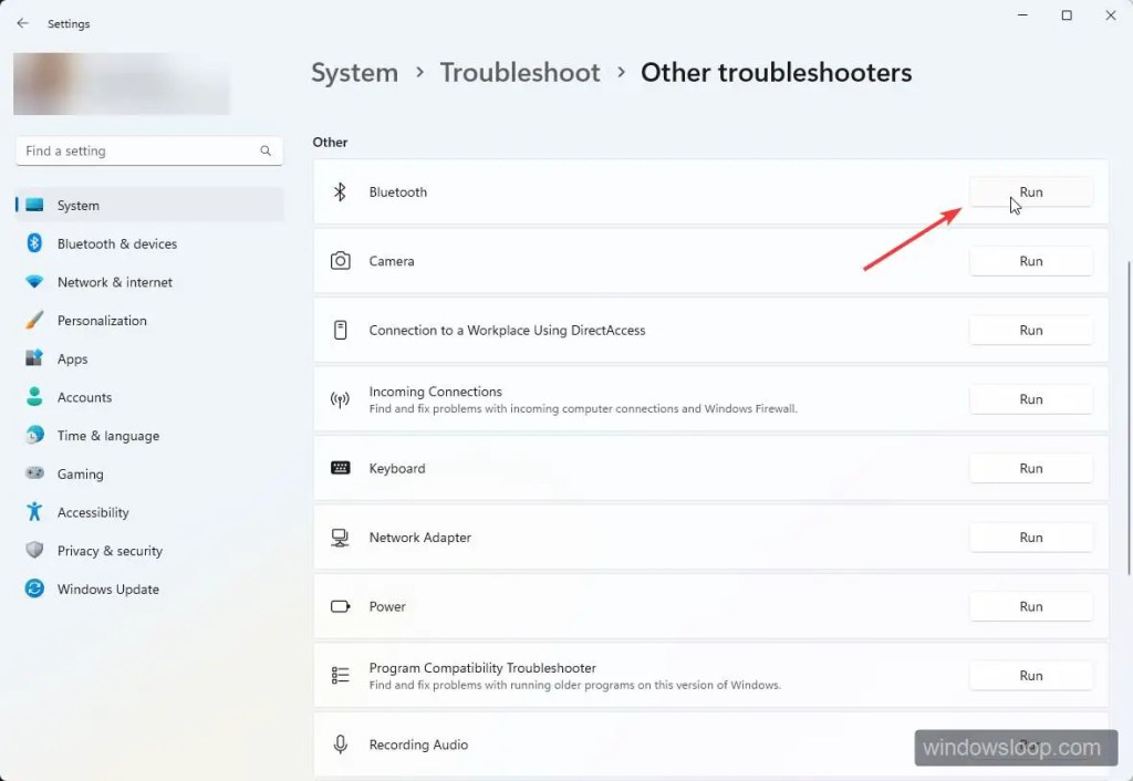 Paso 3: Vaya a la página”Otros solucionadores de problemas“y haga clic en el botón”Ejecutar“junto a “Bluetooth.”