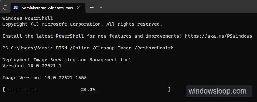 Paso 2: Ejecute el comando”DISM/Online/Cleanup-Image/RestoreHealth“. Escanea y soluciona cualquier problema con la imagen del sistema.