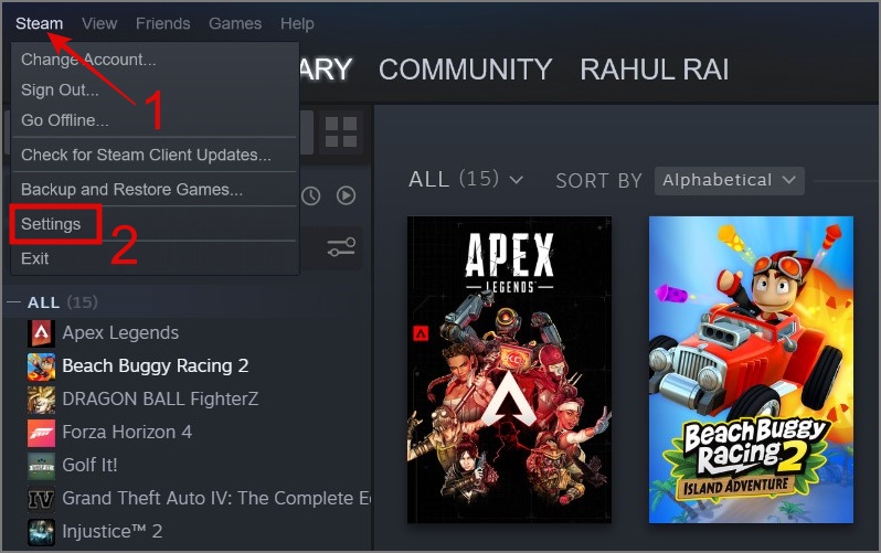 1. Haz clic en la pestaña Steam y selecciona Configuración.