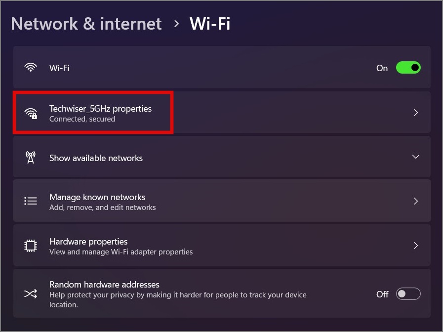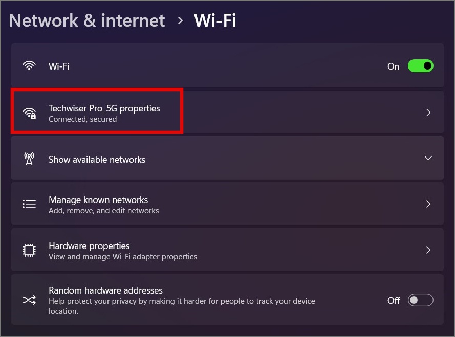 2. Haz clic en Propiedades Wi-Fi (red Wi-Fi a la que estás conectado).