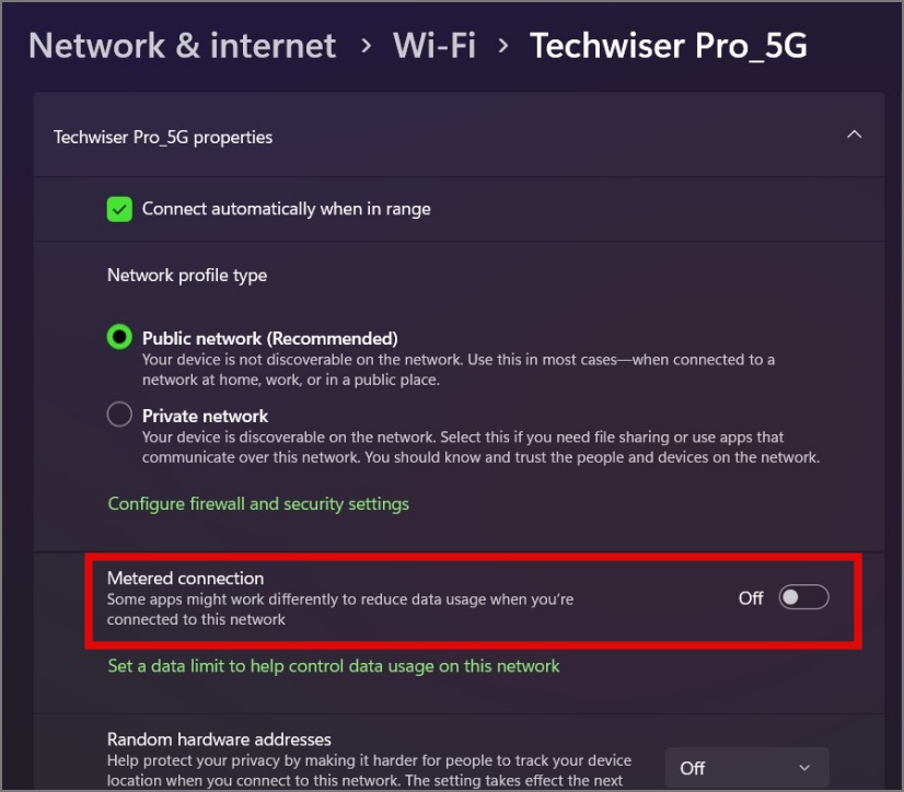 4. Por último, deshabilite el interruptor junto a Conexión medida.