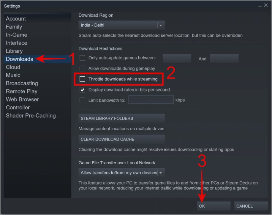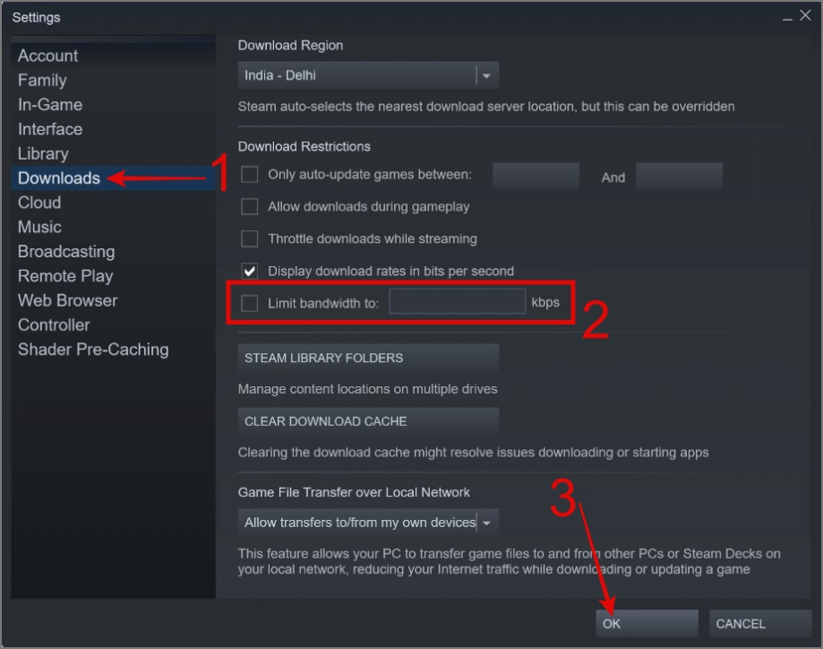 Para eliminar la limitación de ancho de banda de Steam, simplemente vaya a Configuración de Steam > Descargas y desmarque la casilla que dice “Limitar ancho de banda” y luego haga clic en Aceptar botón.