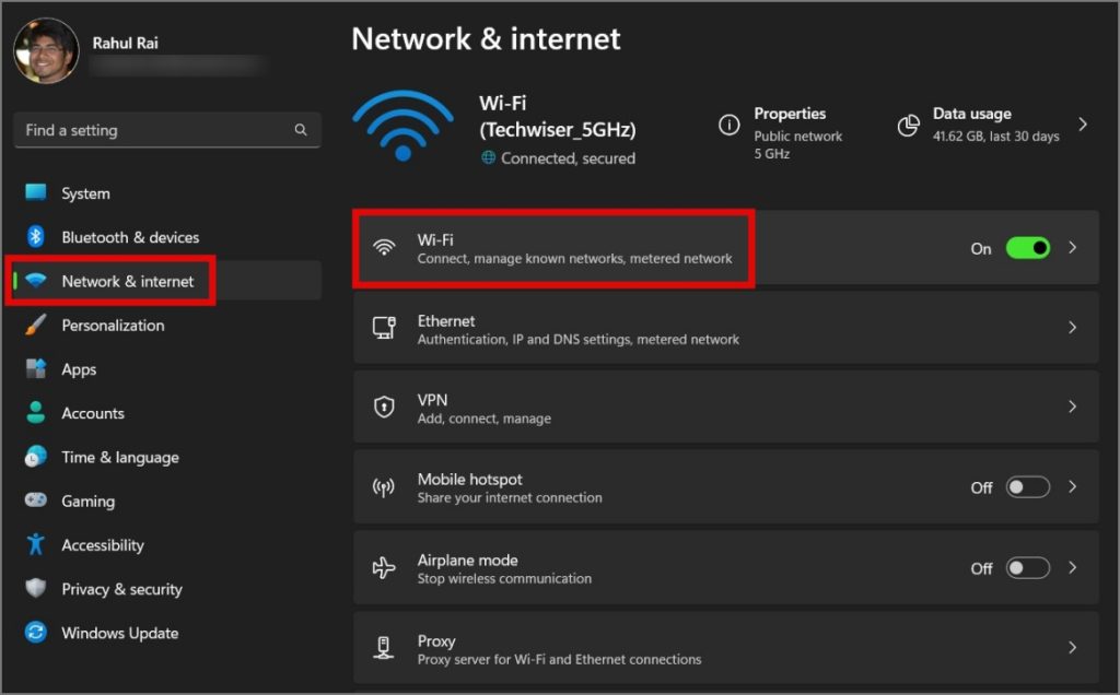 2. En el panel izquierdo, seleccione la configuración de Red e Internet y luego vaya a Wi-Fi.