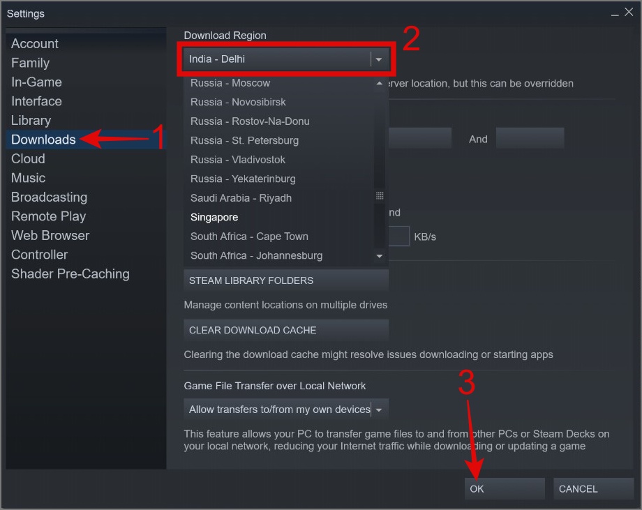3. En la Región de descarga, seleccione su servidor Steam preferido y luego presione el botón Aceptar.