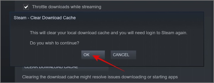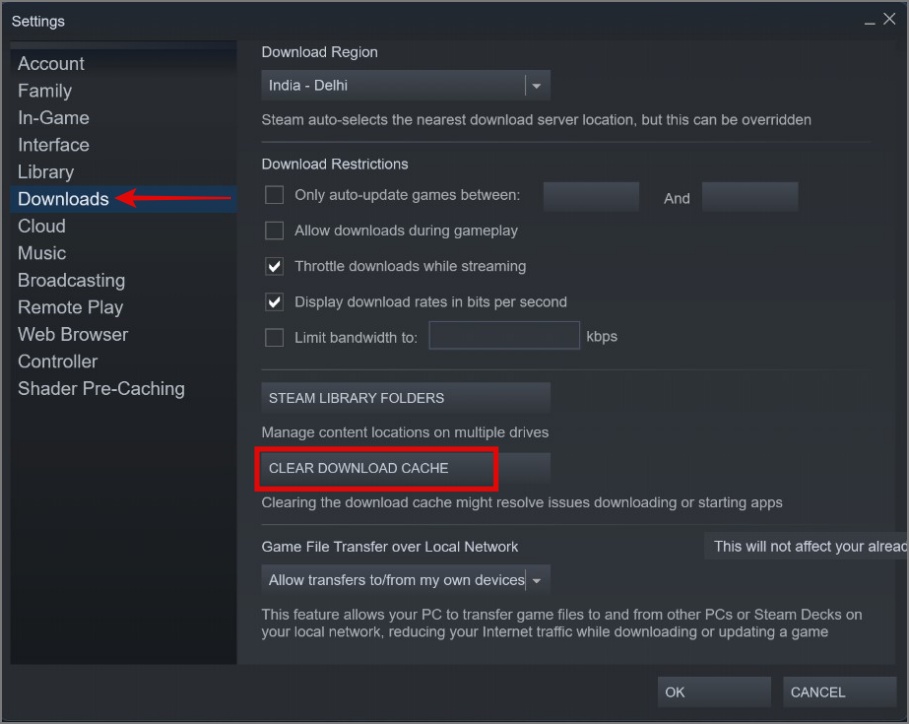 1. Vaya a Steam > Configuración > Descargas. Después de eso, haga clic en el botón Borrar caché de descarga.