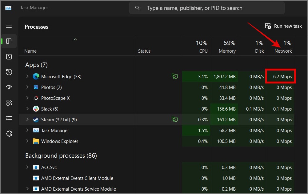 Otra cosa que puede hacer es abrir el Administrador de tareas (Ctrl + Shift + Esc) y haga clic en la pestaña Red para identificar qué aplicación está consumiendo una cantidad significativa de datos en segundo plano.