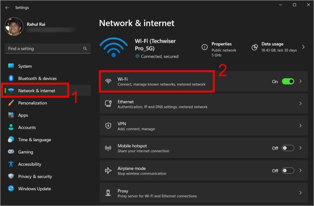 1. Abra Configuración de Windows (Tecla de Windows + I) y vaya a Red e Internet > Wi-Fi.