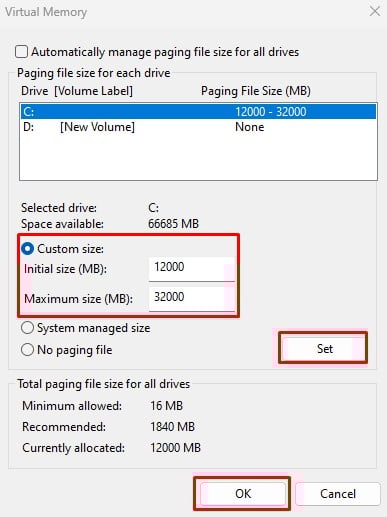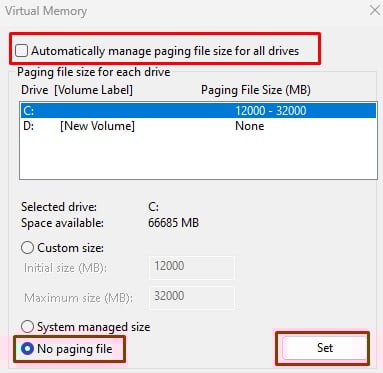 Ahora, haga clic en el volumen en el que desea configurar pagefile.sys. Verifique Tamaño administrado por el sistema y haga clic en Establecer.