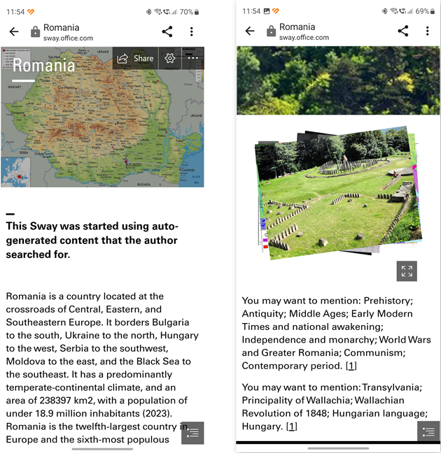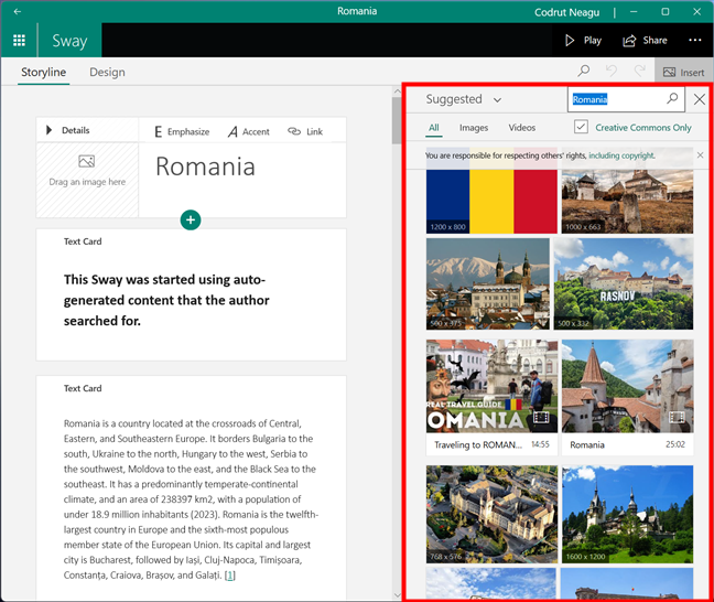 En mi ejemplo, buscar contenido relacionado con Rumania hace que Sway traiga sugerencias de contenido del Internet. Estos se muestran en un panel en el lado derecho y Sway le permite arrastrarlos y soltarlos en su proyecto.