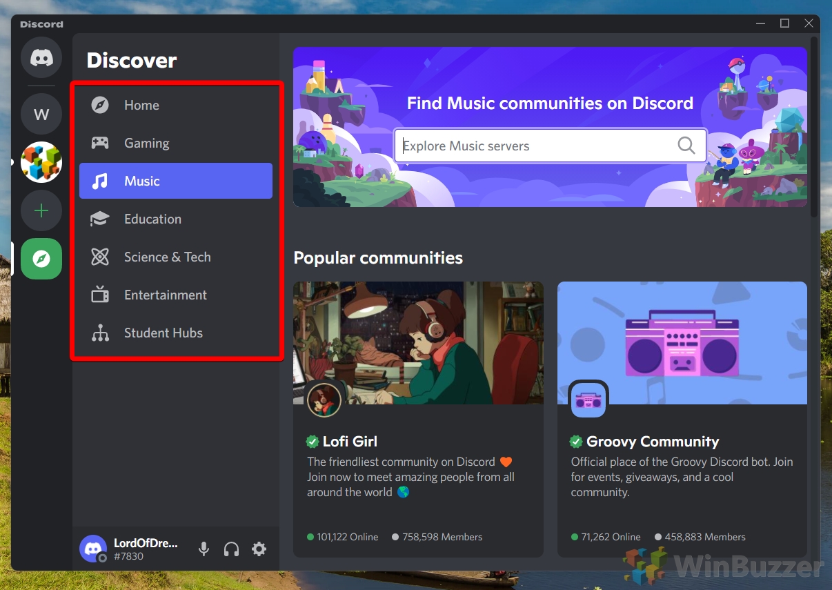 La barra lateral”Descubrir”le permite encontrar servidores Discord por varias categorías