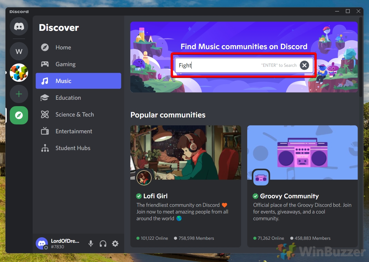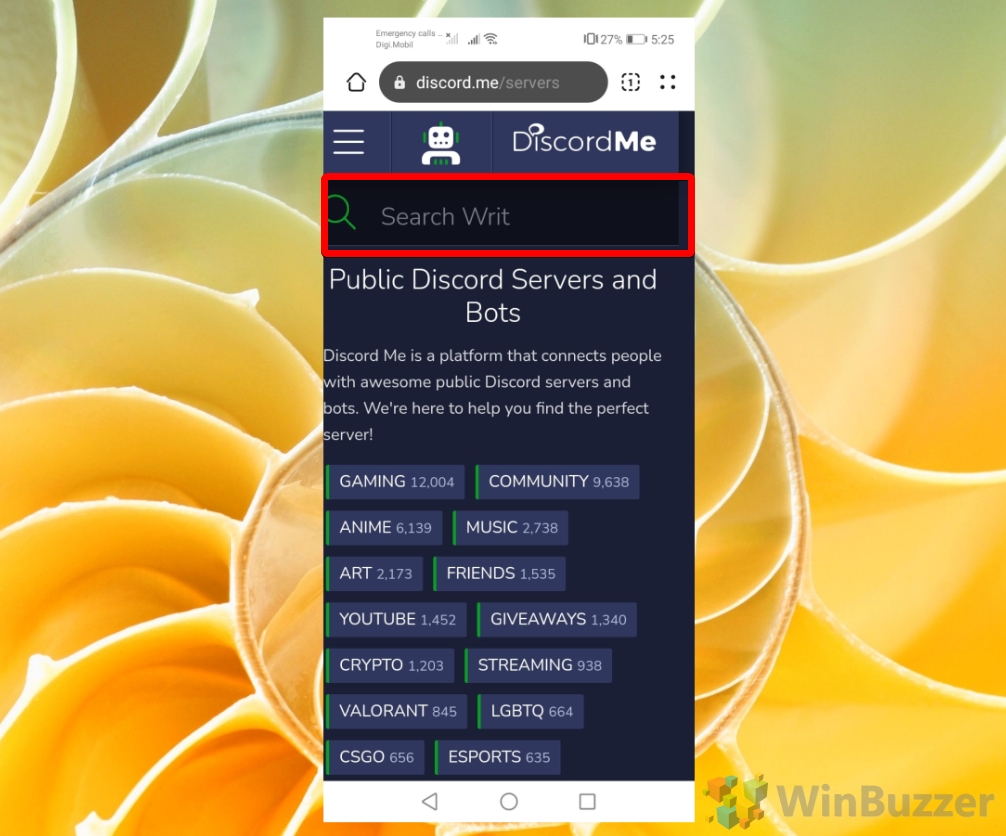 Puedes usar la barra de búsqueda para encontrar un servidor de Discord por palabra clave