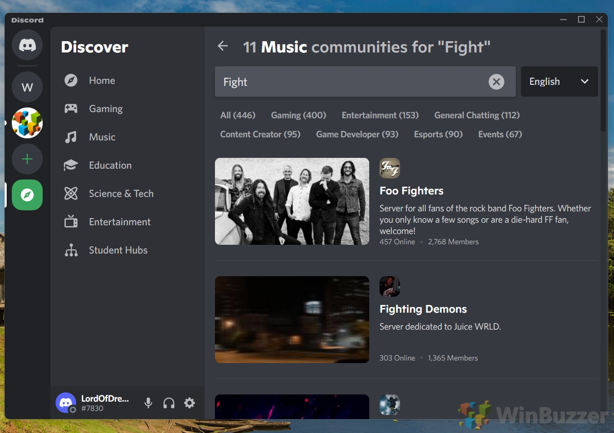 La búsqueda por palabra clave mostrará una lista de servidores de Discord que se pueden filtrar por subcategoría e idioma