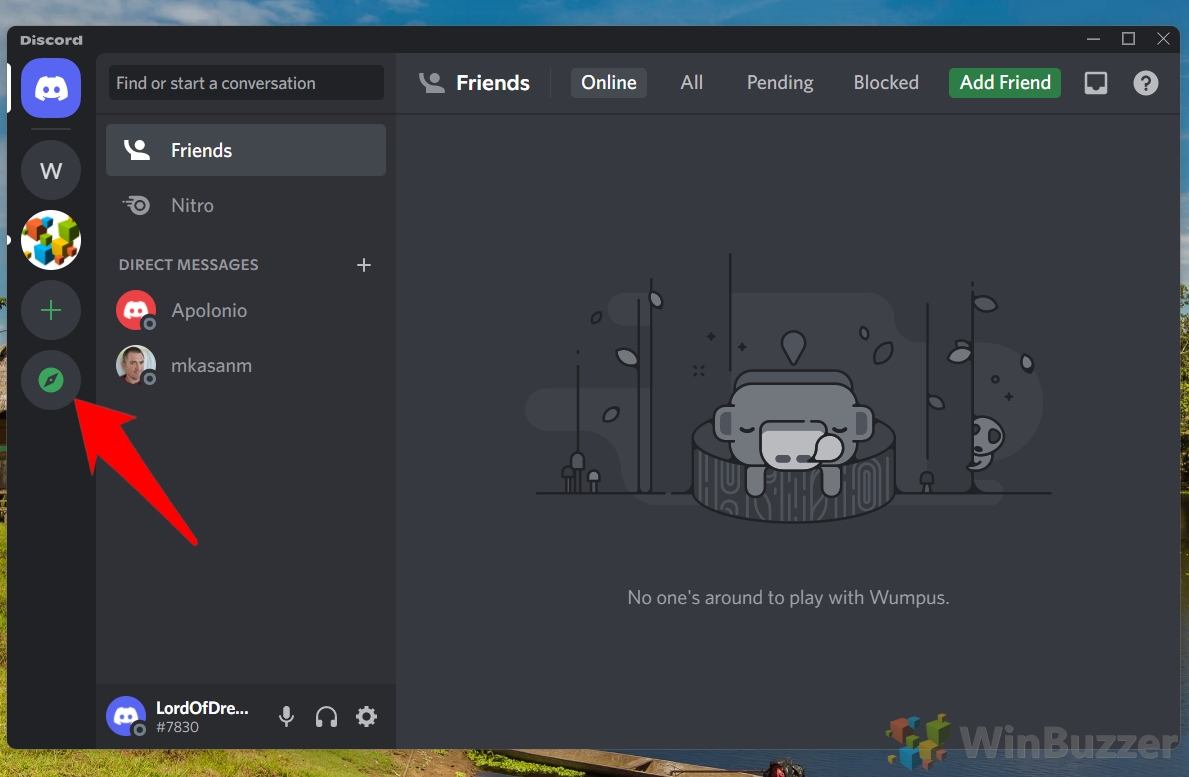 Para acceder a la función de descubrimiento del servidor, haga clic en el ícono de lupa en la barra lateral izquierda de Discord aplicación o sitio web.
