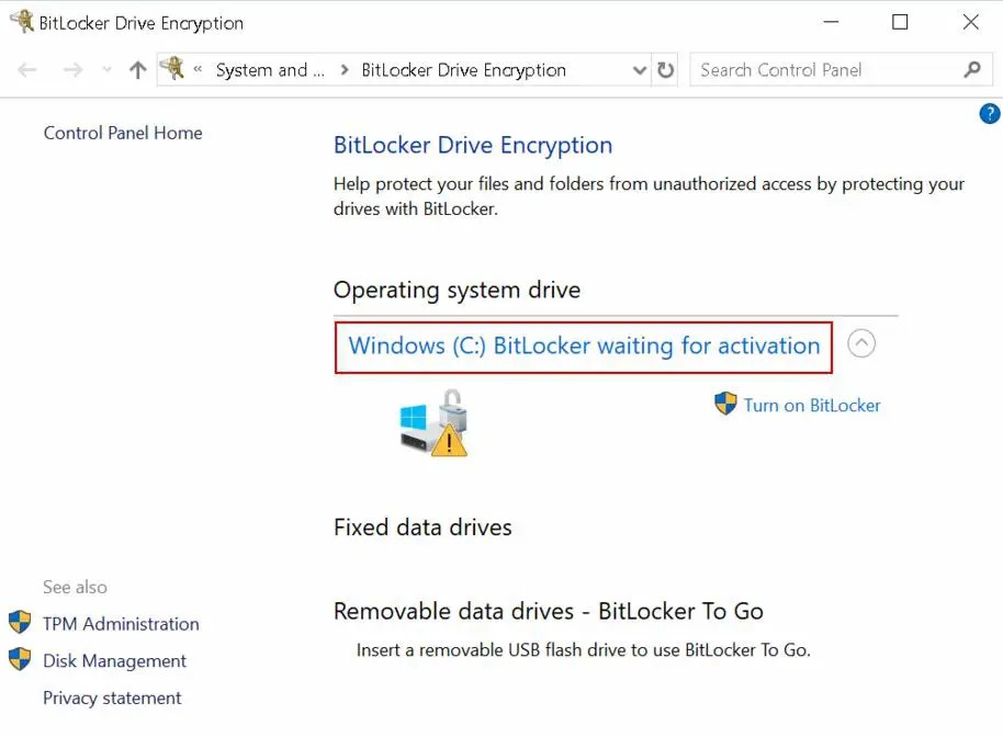 @media(min-width:0px){}Si ve el mensaje BitLocker en espera de activación en el Panel de control o cuando pasa el cursor sobre el icono de precaución de BitLocker en el Explorador de archivos, siga los pasos que se indican a continuación para solucionarlo..