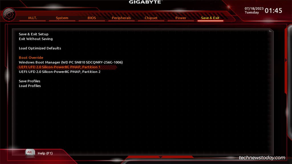 Presione Supr al iniciar para ingresar a la configuración del BIOS como antes. Busque la sección Boot Override en las pestañas BIOS o Guardar y salir. Seleccione el USB, presione Entrar y acepte el mensaje de confirmación para iniciar desde el USB.