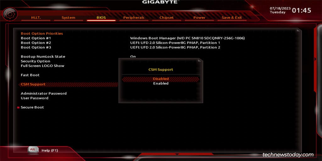 Alternativamente, puede presionar F2 para cambiar al modo Avanzado/Clásico. Vaya a la pestaña BIOS y resalte Opción de arranque #1. Presiona Enter y selecciona tu USB aquí.