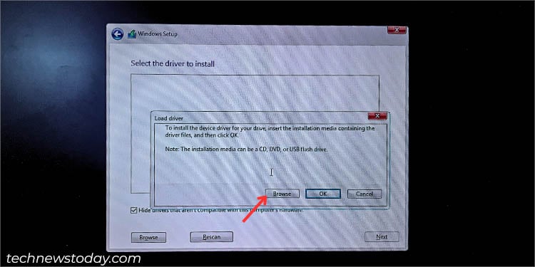 Después de elegir la instalación personalizada del sistema operativo, haga clic en la opción Cargar controlador.. Ahora debería obtener un aviso de’Cargar controlador’. Asegúrese de haber insertado la unidad flash que contiene los controladores SATA/NVMe RAID (preparado anteriormente). Presiona el botón Examinar.