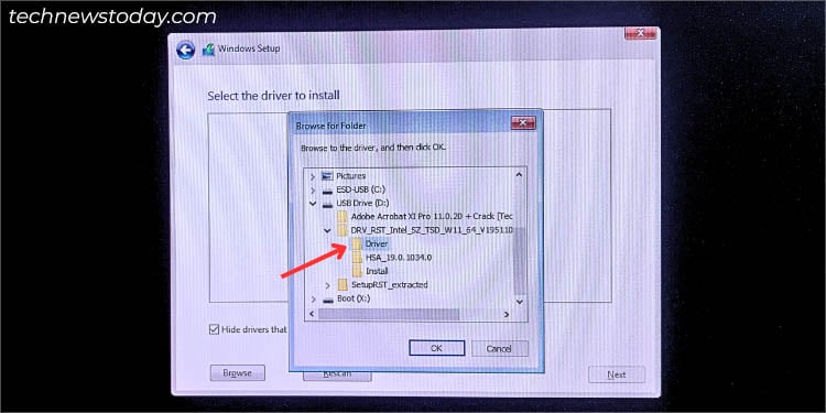 En el nuevo cuadro de diálogo, navegue hasta su unidad flash y busque la carpeta de controladores dentro del directorio DRV_RST_Intel_SZ_TSD_[YourOS_Version] (nombre predeterminado).