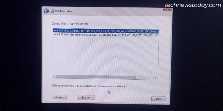 Este es el caso si tuviera descargó los controladores de la página de soporte oficial de su placa base. Este paso podría variar si lo hubiera hecho desde la sección de controladores de Intel. Ahora, debería aparecer una lista de controladores. Seleccione el primero y presione Siguiente. Ahora debería obtener su matriz RAID. Selecciónelo y continúe con la instalación de Windows.