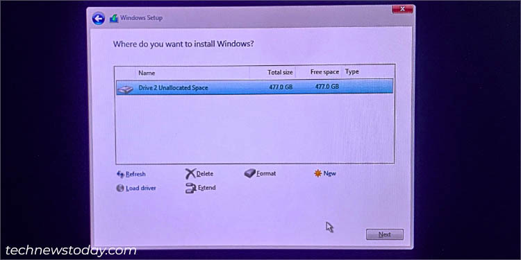 Después de crear un conjunto RAID SATA o NVMe, puede salir del modo BIOS desde su PC ASUS. Inserte una unidad flash de arranque y proceda a instalar Windows. Sin embargo, es probable que no obtenga ninguno de los HDD/SSD durante el proceso debido a la falta de controladores: