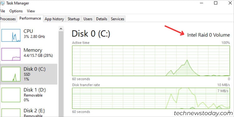 Después de instalar Windows, ahora puede iniciar sesión y verificar rápidamente la matriz RAID desde el Administrador de tareas de Windows > Rendimiento > Disco. Notará que todos sus HDD/SSD funcionarán como un solo disco.