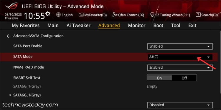 Una vez que esté en ASUS BIOS, cambie a Modo avanzado y vaya a la pestaña Avanzado. Aquí, busque Modo SATA y configure esta opción en RAID.