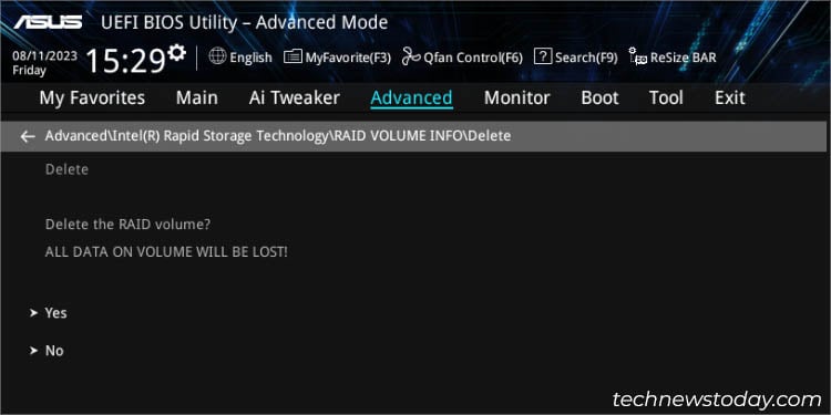 Vaya a Avanzado> Tecnología Intel Rapid Storage. Aquí, seleccione su volumen RAID. En la sección Acciones de volumen, presione la opción Eliminar.
