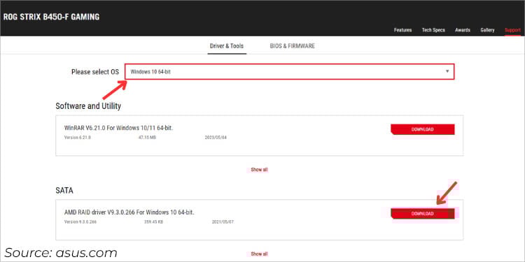 Para empezar, los controladores RAID están disponibles en ASUS y los de tu procesador (Intel o AMD) páginas de soporte. Si bien se supone que ambos son compatibles, es posible que no sean iguales para todos los sistemas.