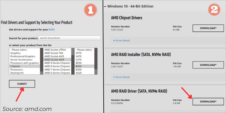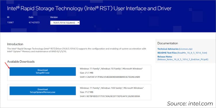 Team Blue debe asegurarse de que sus controladores sean compatibles con la generación del procesador. Simplemente vaya a”Interfaz de usuario y controlador de Intel Rapid Storage Technology (Intel RST)“en su navegador web y descargue el archivo.exe. Utilice el comando./SetupRST.exe-v EXTRACTDRIVERS=SetupRST_extracted en Windows Powershell para extraer todos los archivos que contiene. Mientras tanto, es mucho más fácil para Team Red. Simplemente envíe su conjunto de chips a la página de soporte y controladores de AMD y descargue el controlador AMD RAID (SATA, NVMe RAID) según su sistema operativo.