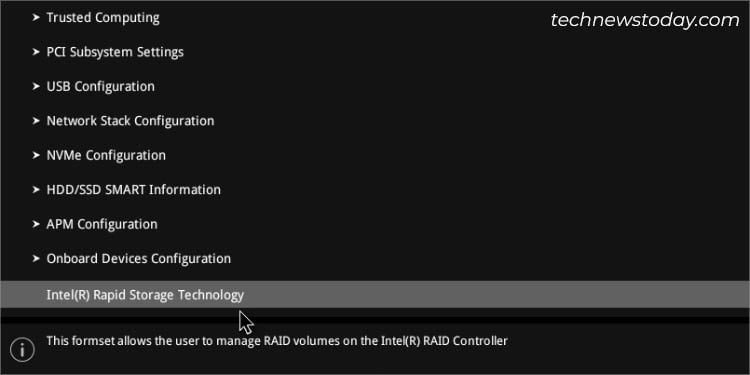 Nota: si su placa base ASUS admite Intel VROC (Virtual RAID on CPU), debe navegar a la sección dedicada en lugar de Intel Rapid Storage Technology. Pero tenga en cuenta que para RAID 1, 5 y 10, necesita obtener un módulo KEY para habilitar la licencia RAID. Además, dicha característica solo es compatible si está utilizando un procesador compatible (se requiere Intel Core X-series) con SSD Intel.
