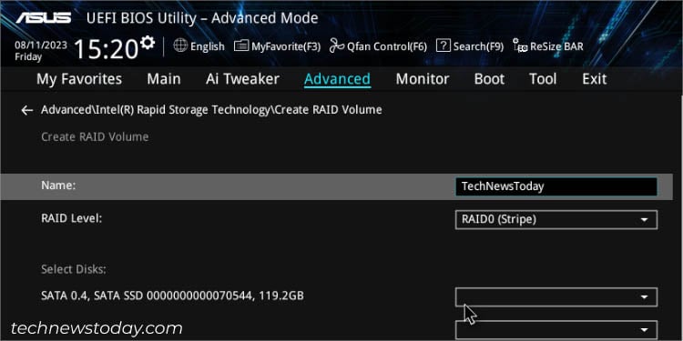 Después de habilitar Tecnología Intel Rapid Storage, debería encontrar la opción relacionada (al final) en la pestaña Avanzado. Seleccione la opción y elija Crear volumen RAID.
