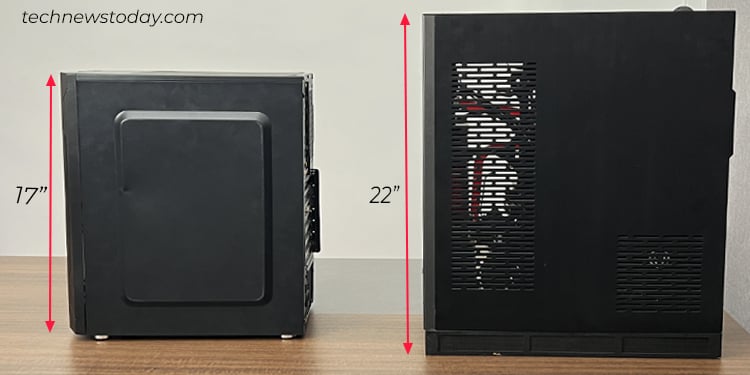 Por el contrario, las cajas de media torre suelen medir entre 45 cm y 55 cm (17 a 21 pulgadas). y cabe fácilmente en su área de trabajo.