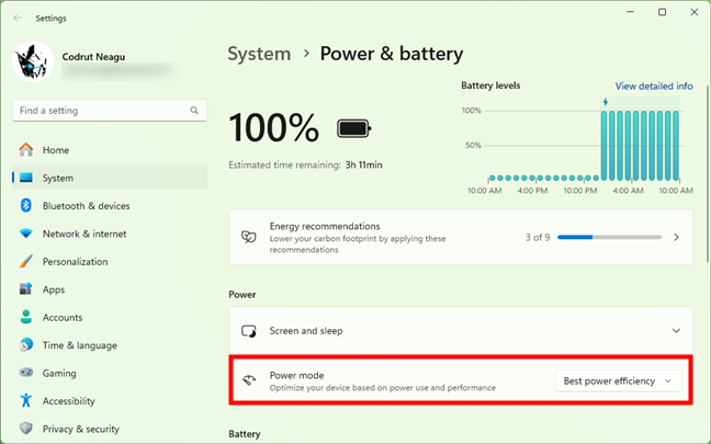 8. Cómo cambiar el brillo en Windows 11 cambiando el modo de energía de su computadora portátil o tableta