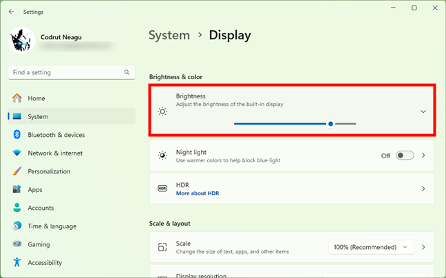 En la página Pantalla, use el control deslizante Brillo debajo de “ Brillo y color”a”Ajustar el brillo de la pantalla integrada”. Arrastre el cursor hacia la derecha para aumentar el brillo de la pantalla de su computadora portátil o arrástrelo hacia la izquierda para reducir el brillo en Windows 11.