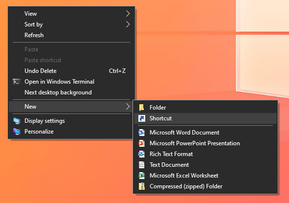 Primero, vaya a su escritorio presionando la “tecla de Windows + D“acceso directo. Una vez que esté en el escritorio, haga clic derecho en cualquier lugar del espacio vacío y seleccione”Nuevo“y luego”Acceso directo“. Esto abre el asistente de acceso directo.