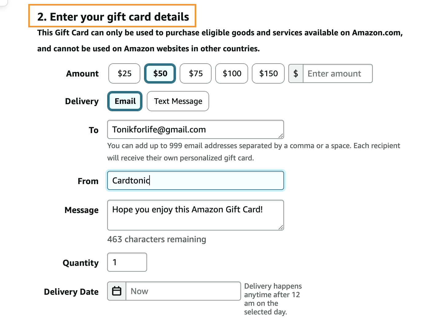 Escriba la dirección de correo electrónico del destinatario con cuidado: allí se entregará la tarjeta de regalo. Luego agregue su nombre, una breve nota personal y la fecha de entrega. Puedes elegir “Ahora” para una entrega instantánea o programarla para una fecha futura.
