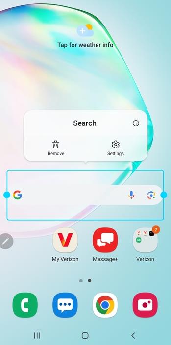 Después de agregar la barra de búsqueda de Google, puede ajustar su tamaño tocando y manteniendo presionado el widget hasta que aparezcan los controladores de cambio de tamaño. Arrastre los controles para agrandar o reducir el widget y vuelva a colocarlo moviéndolo por la pantalla hasta que se ajuste al diseño de su pantalla de inicio.