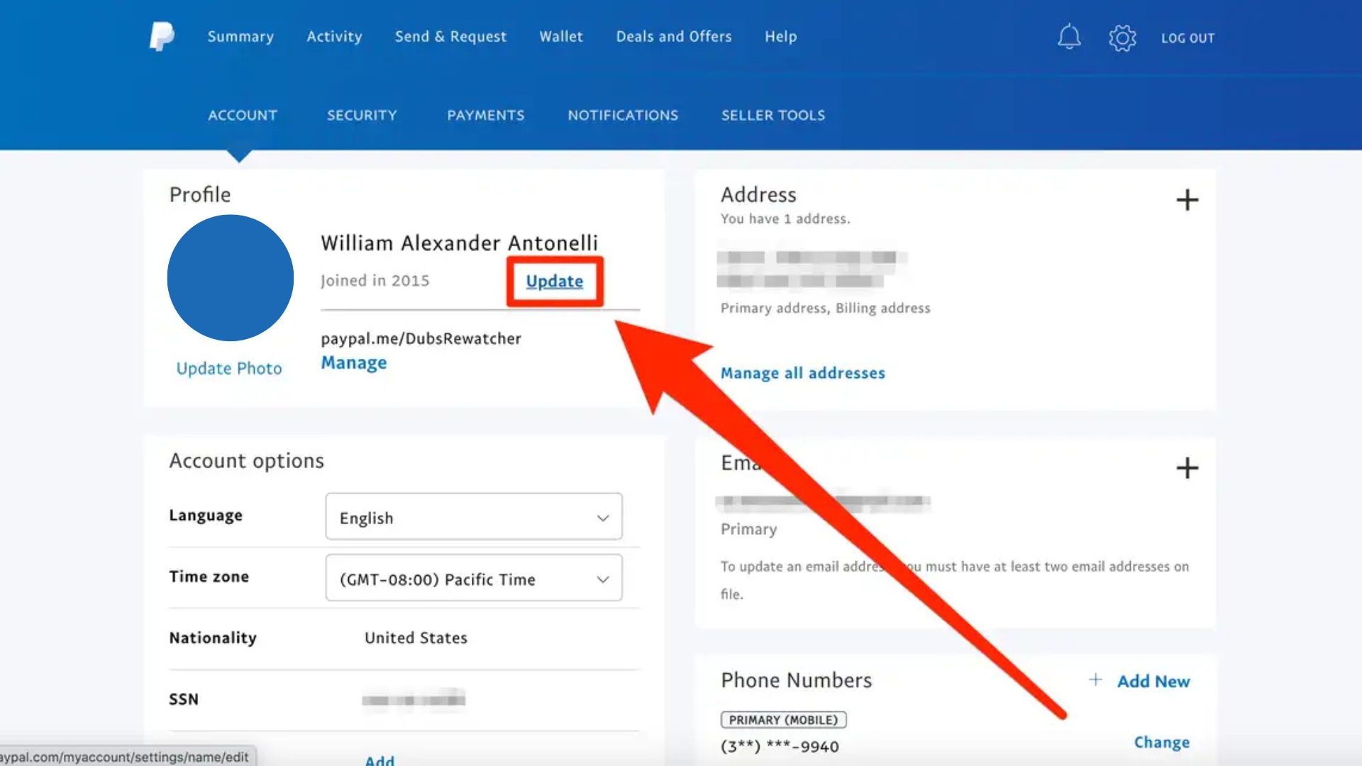 Verá el nombre actualmente vinculado a su cuenta PayPal. Haga clic en Actualizar/Cambiar para realizar el cambio.