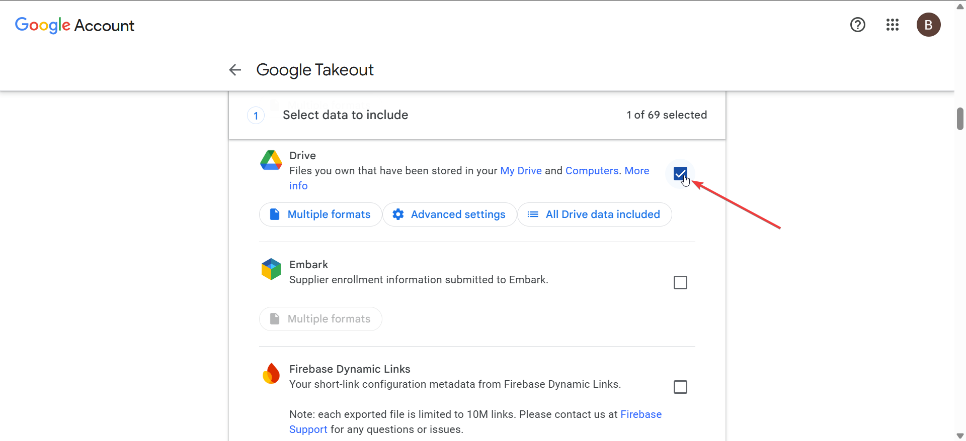 Google Takeout le permite descargar todo desde su cuenta, incluido Drive. Vaya al sitio web de Google Takeout y anule la selección de todo.