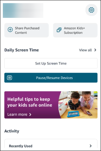 Deslícese hacia abajo desde la parte superior de la pantalla y toque Configuración > Perfiles y biblioteca familiar. Elija el perfil de su hijo y seleccione Amazon Kids. Ahora, elija la opción Panel de padres para que pueda administrar los controles sin salir del dispositivo.