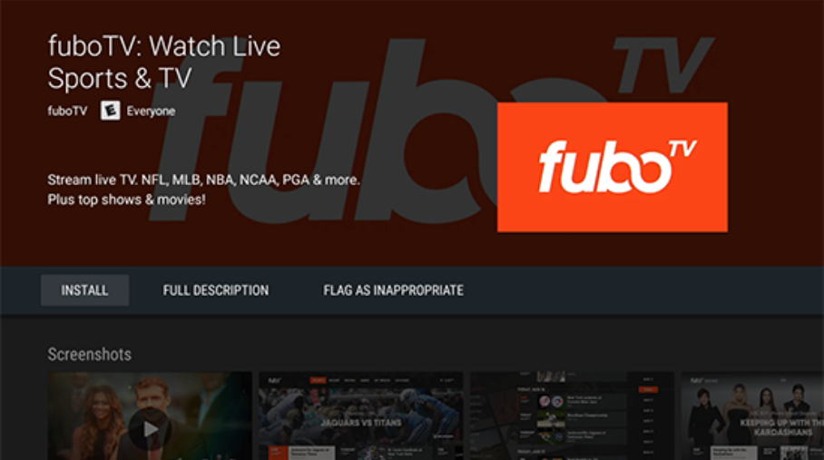 En la página de la aplicación FuboTV, elija Instalar y espere a que la aplicación termine de descargarse. Finalmente, seleccione Abrir e inicie sesión en su cuenta. Una vez que haya iniciado sesión, se cargará la pantalla de inicio y los canales estarán disponibles.