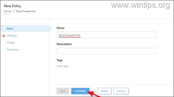 2. En el asistente Nueva política, escriba un nombre y, opcionalmente, una descripción para la nueva política y haga clic en CONTINUAR.